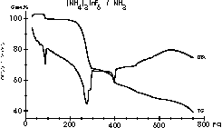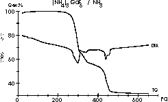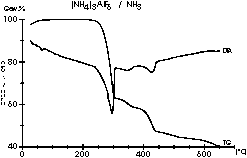 8 | DTA/TG measurement under ammonia! Meike Roos investigated the courses of the ammonolysis reactions of the ammonium hexafluorometalates (NH4)3MF6 (M = Al, Ga, In) with the aid of in-situ powder diffractometry and differential thermal analysis. After finding the optimum measuring parameters we got these amazing diagrams which respond great to the results of the other analytical investigations. This is the Al compound. | |