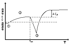 Zu Beginn des Aufheizprogrammes ist eine Anfahrauslenkung zu beobachten, deren Form von der Menge der Referenzsubstanz abhängig ist(1). Im weiteren Verlauf zeigt die Kurve die Änderung der Wärmekapazität der Probe(2). Während des Schmelzvorganges ist die Steigung der Kurve der Heizrate proportional. Am Punkt (3) ist die Substanz vollständig aufgeschmolzen, der weitere Verlauf zeigt die exponentielle Relaxation. Wenn sich die Wärmekapazität Cp während der Phasenumwandlung geändert hat, ist die Basislinie in der Höhe verschoben. Die Schmelztemperatur wird als Tonset extrapoliert. |